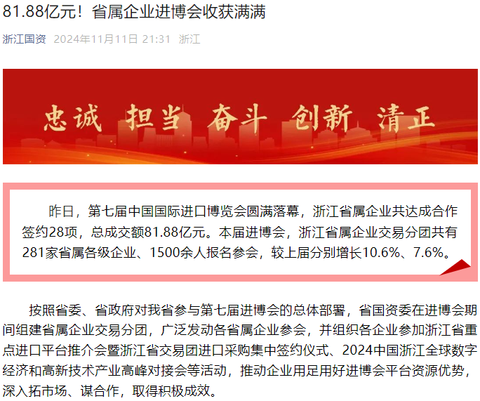 11月5日至10日,第七屆中國國際進(jìn)口博覽會(進(jìn)博會)在上海國家會展中心舉辦。本屆進(jìn)博會以“新時(shí)代,共享未來”為主題,吸引了來自152個(gè)國家、地區(qū)和國際組織的參展商。浙江土畜組織旗下6家企業(yè)的30余名代表積極參會。浙江日報(bào)、潮新聞、浙江衛(wèi)視、浙江國資等多家媒體對浙江土畜參會進(jìn)行了報(bào)道。