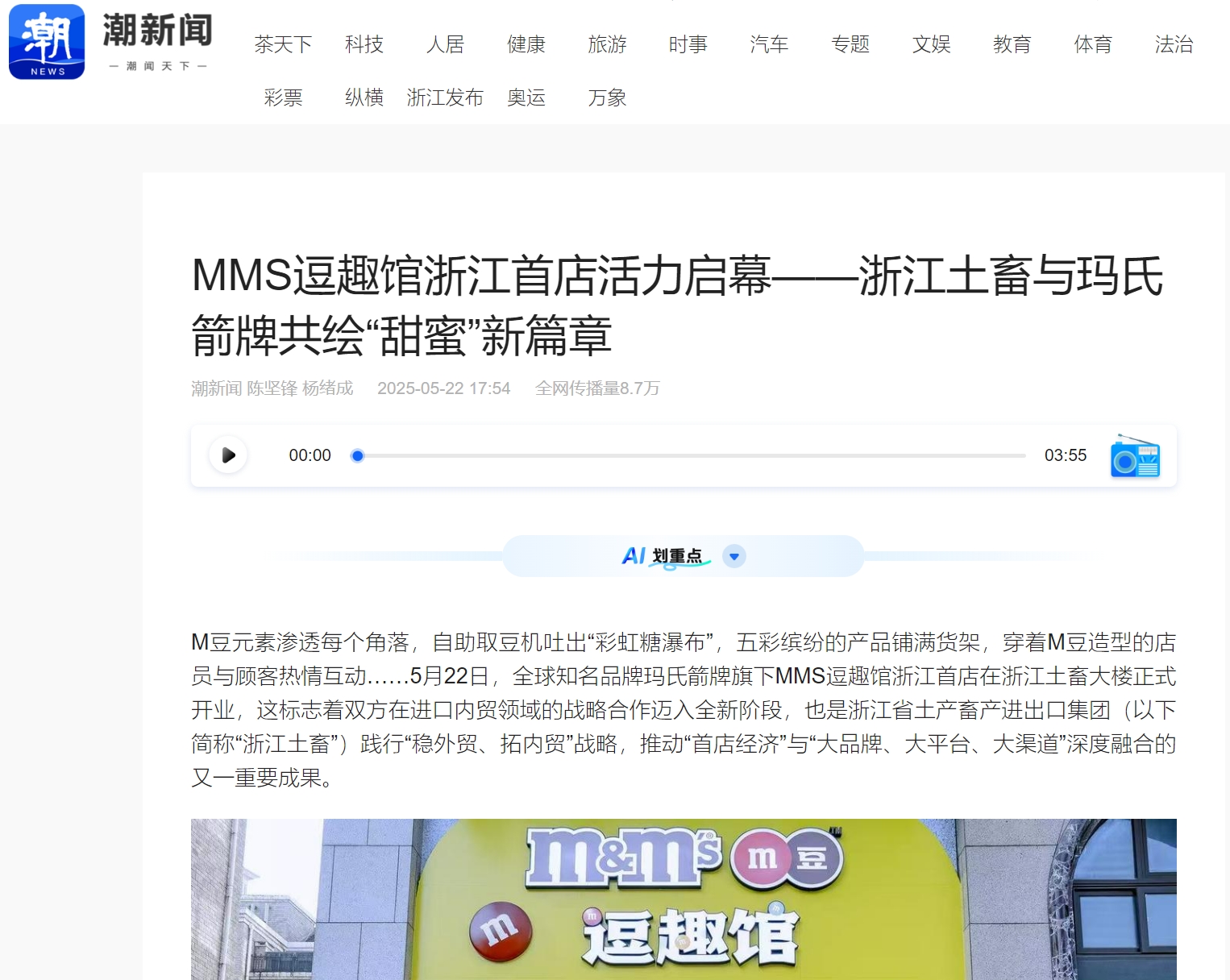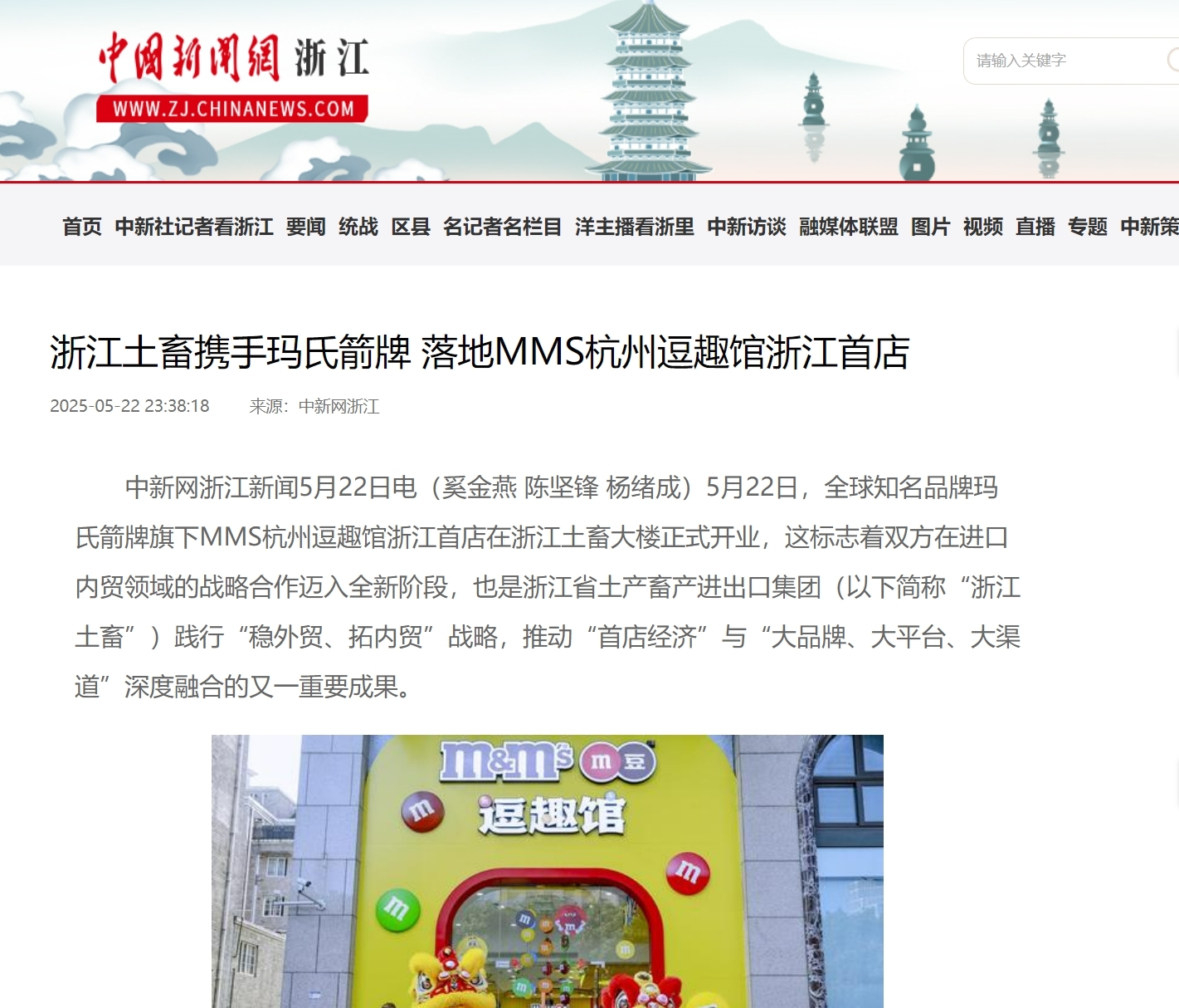 5月22日,全球知名品牌瑪氏箭牌旗下MMS逗趣館浙江首店在浙江土畜大樓正式開業(yè),這標(biāo)志著雙方在進(jìn)口內(nèi)貿(mào)領(lǐng)域的戰(zhàn)略合作邁入全新階段,也是浙江省土產(chǎn)畜產(chǎn)進(jìn)出口集團(tuán)踐行“穩(wěn)外貿(mào)、拓內(nèi)貿(mào)”戰(zhàn)略,推動(dòng)“首店經(jīng)濟(jì)”與“大品牌、大平臺、大渠道”深度融合的又一重要成果。MMS逗趣館浙江首店落地獲中新社浙江分社、潮新聞、今日長三角等多家媒體關(guān)注報(bào)道。