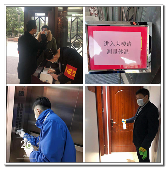 物業(yè)服務(wù)中心、華祥保潔在辦公室統(tǒng)一指揮下,全力做好大樓的防疫保障工作。門崗員工嚴(yán)格執(zhí)行來(lái)訪登記制度,對(duì)全體進(jìn)入大樓人員開(kāi)展體溫檢測(cè)、詢問(wèn)湖武漢、溫州、臺(tái)州等疫情區(qū)接觸史情況,并做好相關(guān)信息登記備查;落實(shí)專人每天對(duì)一樓大堂、前臺(tái)、電梯廳、公共衛(wèi)生間、監(jiān)控室等公共部位及重要值班場(chǎng)所,用消毒液每天進(jìn)行環(huán)境消毒,并適當(dāng)保持一定數(shù)量和時(shí)間通風(fēng)工作,確保大樓環(huán)境安全。