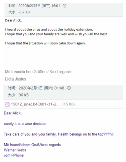作為業(yè)務(wù)一線的業(yè)務(wù)部門,業(yè)務(wù)六部的客戶分布在美國,德國,意大利,荷蘭等國家,在得知疫情的第一時(shí)間,各種問候的郵件就雪花片一般地飛來,因?yàn)榧倨谠诩?,業(yè)務(wù)員沒有第一時(shí)間看到郵件,客人就通過微信,甚至直接電話前來詢問是否平安。