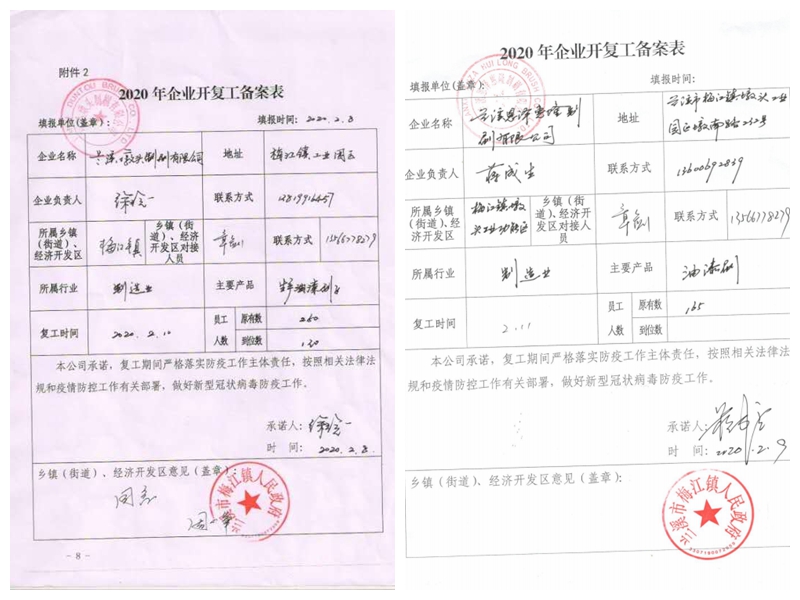 2月8日,省土畜下屬蘭溪墩頭制刷有限公司報(bào)備的19項(xiàng)防控措施獲得蘭溪市梅江鎮(zhèn)人民政府批準(zhǔn),成為當(dāng)?shù)厥着絾?dòng)復(fù)工流程的企業(yè)。2月9日,省土畜下屬恩澤惠隆制刷有限公司的復(fù)工申請(qǐng)獲得蘭溪市梅江鎮(zhèn)人民政府批準(zhǔn)。