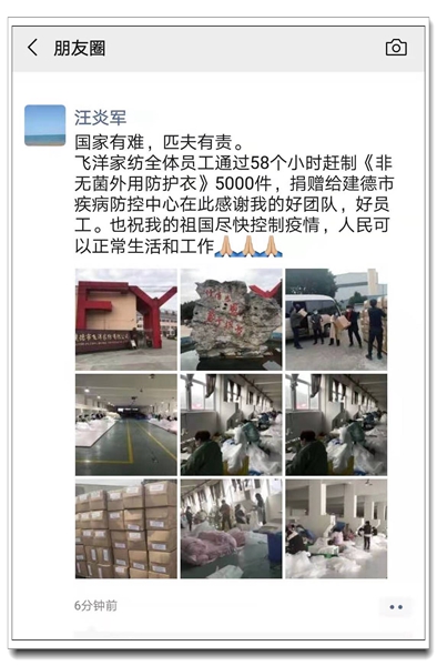 除了給我們加油鼓氣的韓國供貨商,業(yè)務(wù)十一部的國內(nèi)生產(chǎn)企業(yè)同樣讓人肅然起敬。建德飛洋家紡?fù)粞总娍偨?jīng)理在春節(jié)假期還未結(jié)束的時候,就緊急召回所有本地員工,在58小時內(nèi)趕制出5000件“非無菌外用防護(hù)衣”捐贈給建德市疾病防控中心。無論是飛洋家紡充滿社會責(zé)任感的慷慨老板,還是不計報酬、不辭辛苦的普通工人,無不讓人動容感懷,一句“國家有難,匹夫有責(zé)。”不禁讓人潸然淚下。