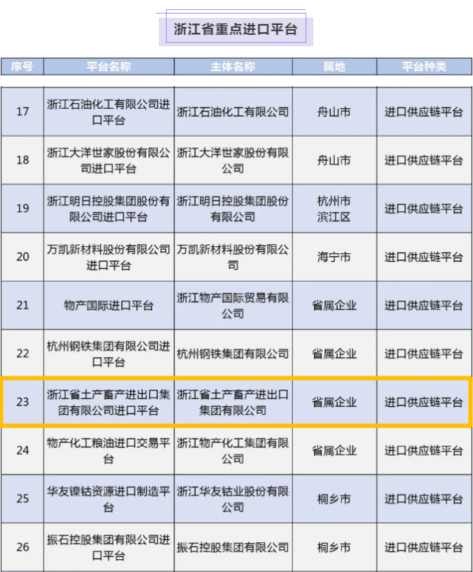 近日,浙江省商務(wù)廳公布了省進(jìn)口貿(mào)易促進(jìn)創(chuàng)新示范區(qū)和省重點(diǎn)進(jìn)口平臺(tái)名單,作為國家農(nóng)業(yè)產(chǎn)業(yè)化龍頭企業(yè)和省屬大型外貿(mào)企業(yè),省土畜被評(píng)為浙江省重點(diǎn)進(jìn)口平臺(tái),成為浙江首批54個(gè)省級(jí)重點(diǎn)進(jìn)口平臺(tái)之一,同時(shí)也是省國貿(mào)集團(tuán)旗下唯一獲評(píng)的企業(yè)。